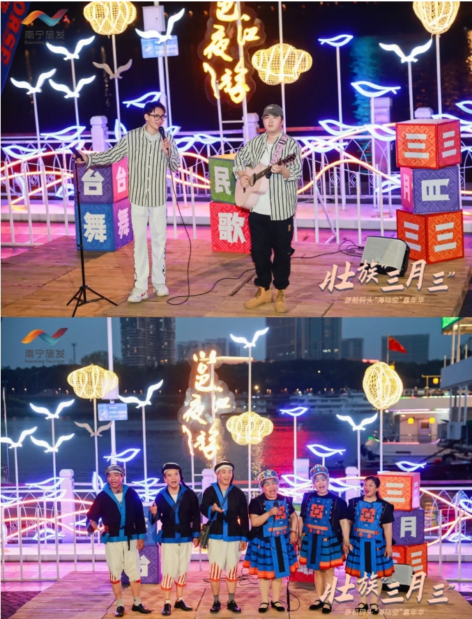 三月三期間,民生旅游碼頭邕江夜游項(xiàng)目推出穿民族服飾免費(fèi)乘坐特定航班、躉船民族服飾試裝區(qū)、演奏非遺獨(dú)弦琴、滑板+陸沖極限運(yùn)動(dòng)賽、潮流音樂精良打酒站、少兒鴻鵠樂坊快閃等精彩活動(dòng),讓市民和游客們?cè)谶@個(gè)廣西特有的節(jié)日里感受到了濃厚的民族文化氛圍和節(jié)日的歡樂,成為了市民和游客們歡度佳節(jié)的熱門選擇,留下了美好的回憶。