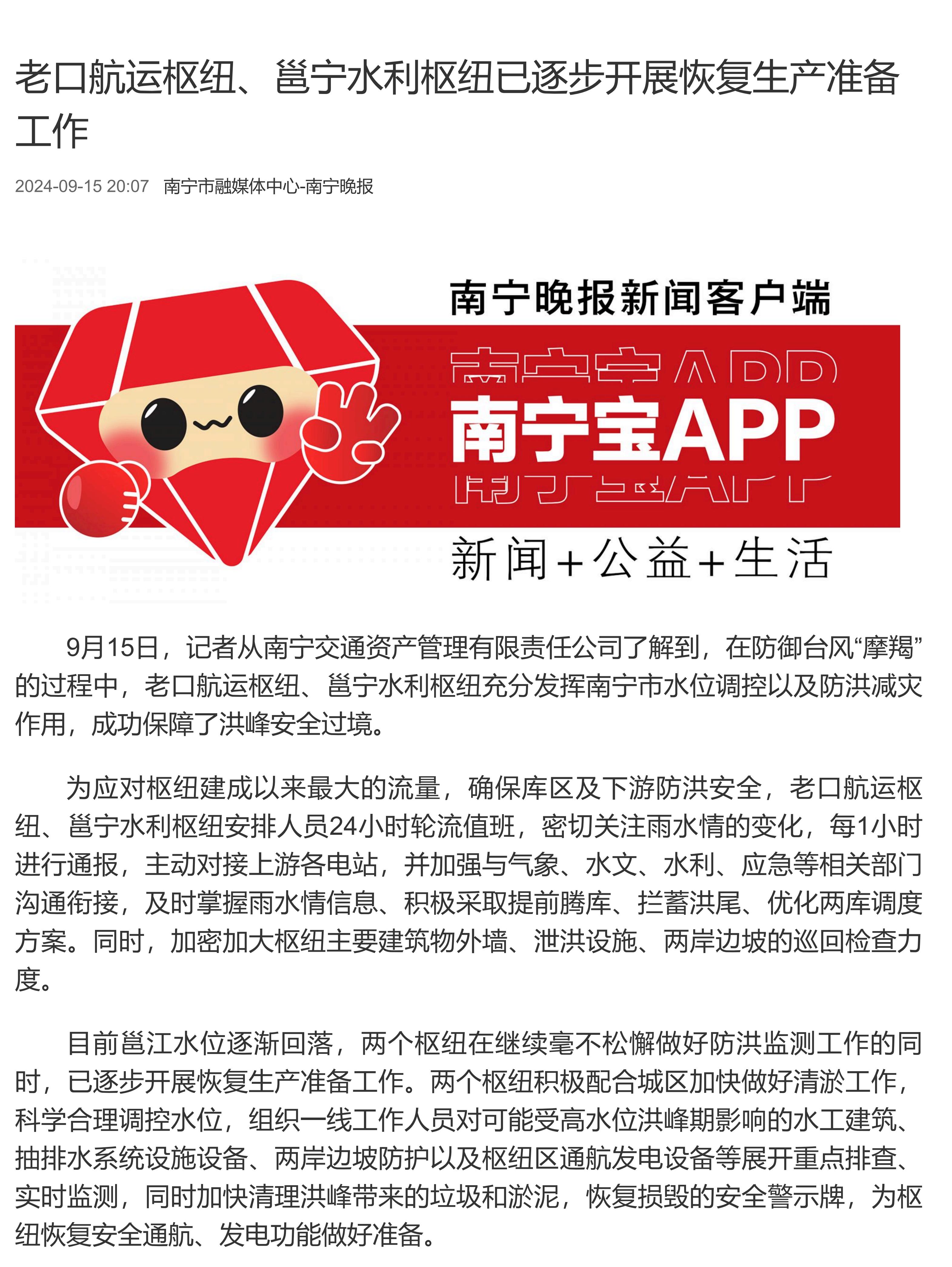 老口航運(yùn)樞紐、邕寧水利樞紐已逐步開(kāi)展恢復(fù)生產(chǎn)準(zhǔn)備工作